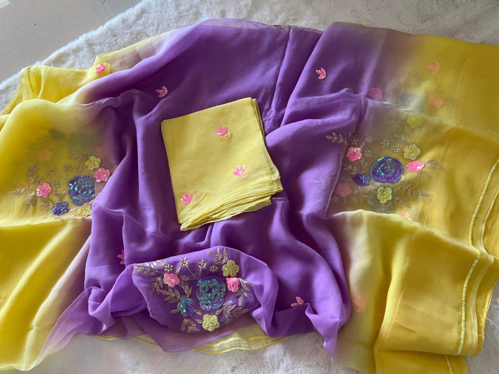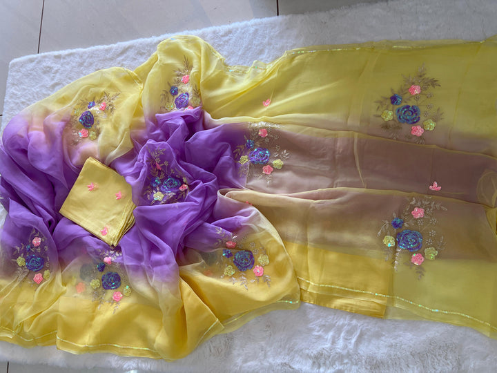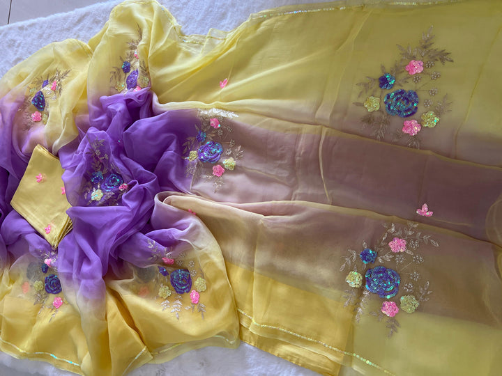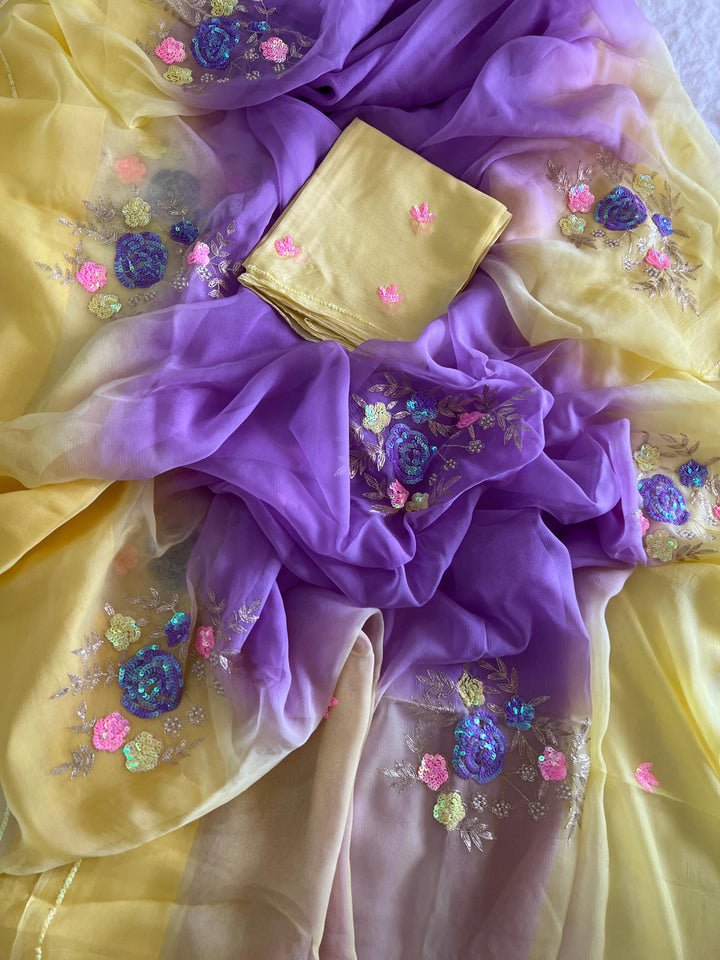 Diamond chiffon saree hand dyed in shades of soft lemon and lavender, laden with hand embroidered bunches of different sized florals in sequins, aari and pearls. The saree comes with a running blouse piece, with light work on sleeves.