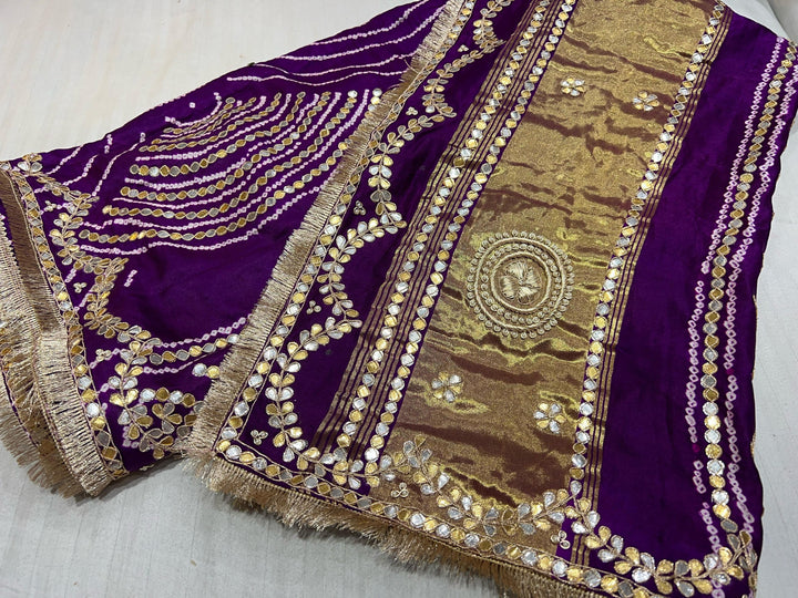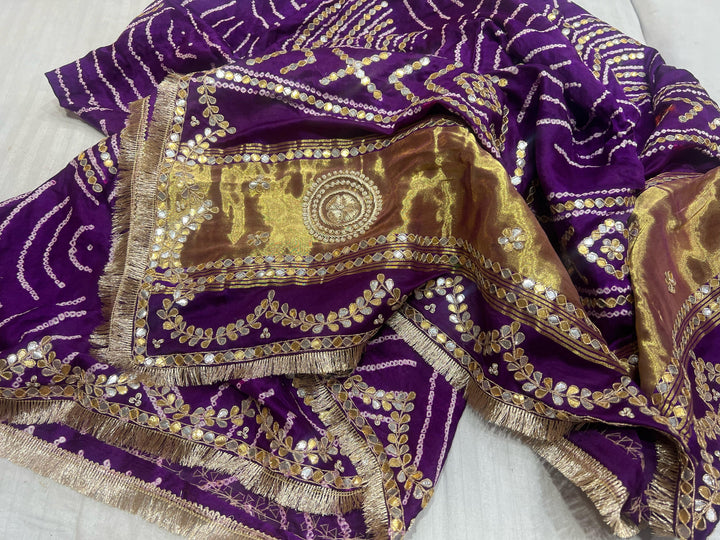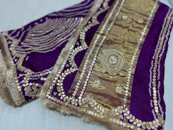 This stunning Magenta Purple Pure Gajji Silk Rai Bandhej features intricate tie-dye patterns and is complemented by a rich Zari Border for a regal finish. The Dupatta, crafted from pure Gajji silk, showcases a handwoven Wifi Pattern with Rai Bandhej design. It’s further enhanced with exquisite Gotapatti, Dori, Zardozi handwork, and a delicate Kiran Border, adding elegance and charm to this masterpiece. With a length of 2.5 meters, this ensemble is perfect for weddings, festivals, and special occasions.