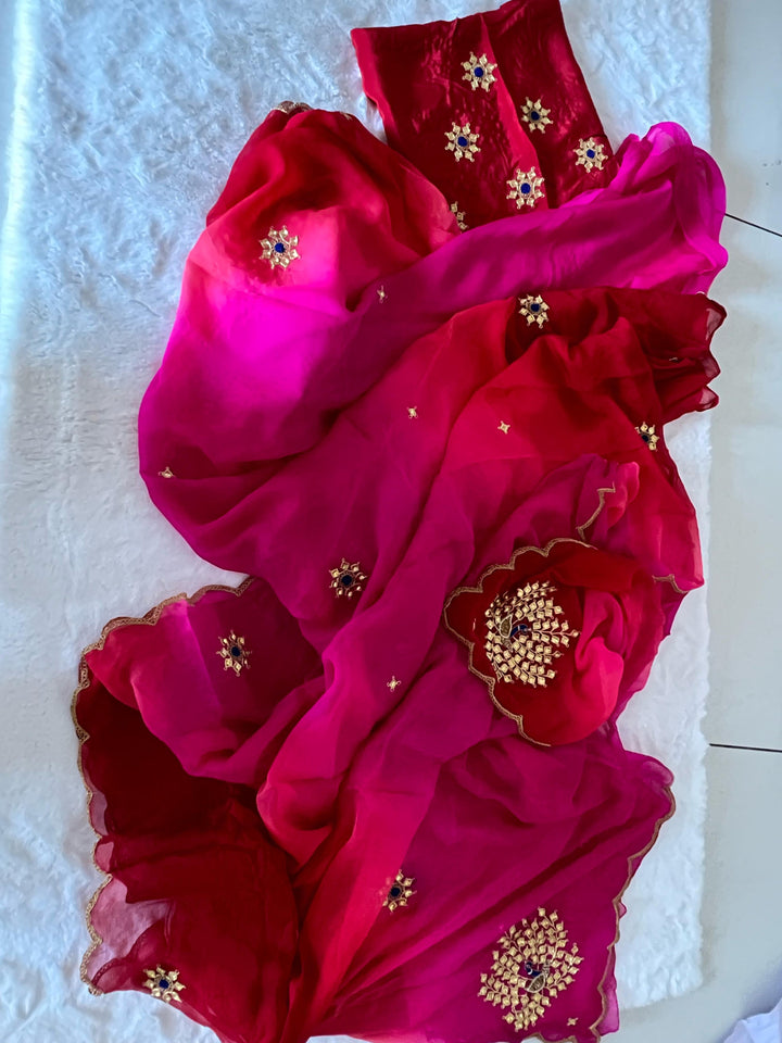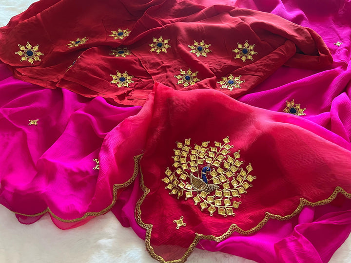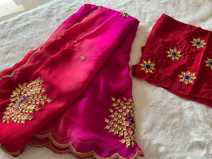 Celebrate in style with the Morni Festive Edition Saree, crafted from luxurious Double Diamond Chiffon. This royal saree is enhanced with intricate Danka Work Dori and a delicate Cutwork Border, adding an elegant, festive touch. Paired with a Pure Silk Blouse, this ensemble combines timeless craftsmanship with sophisticated charm, perfect for any special occasion or celebration.