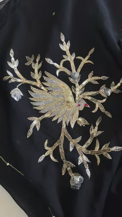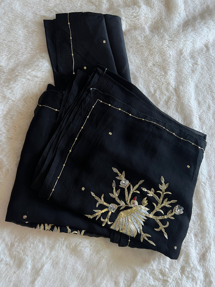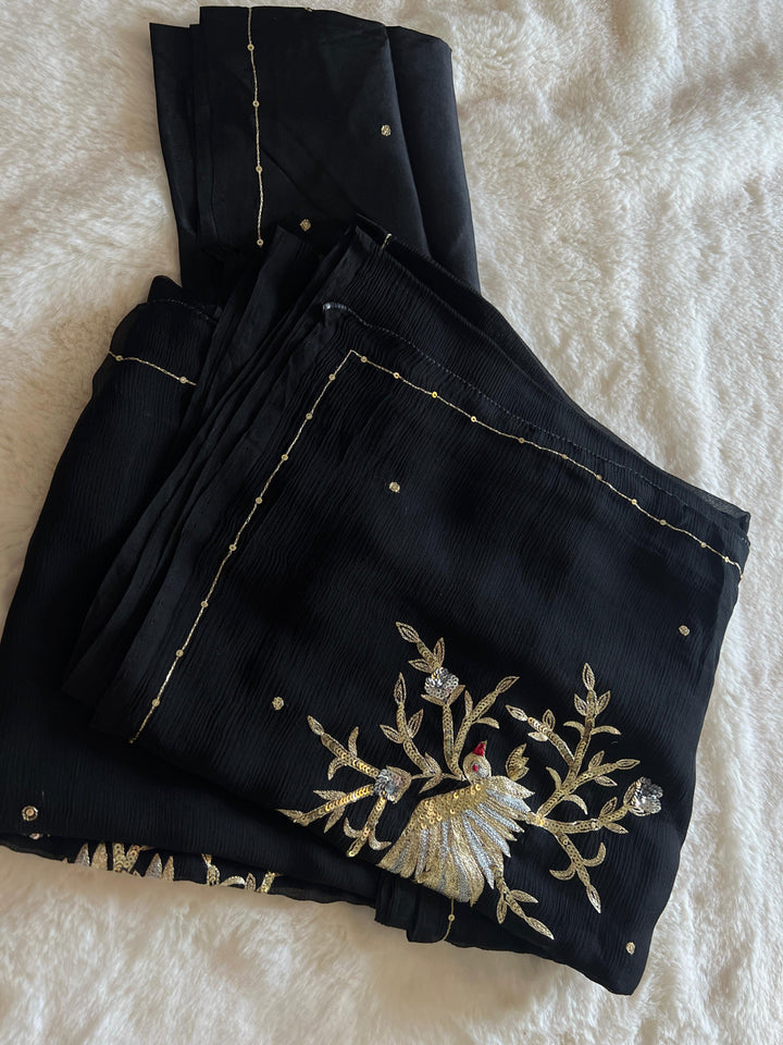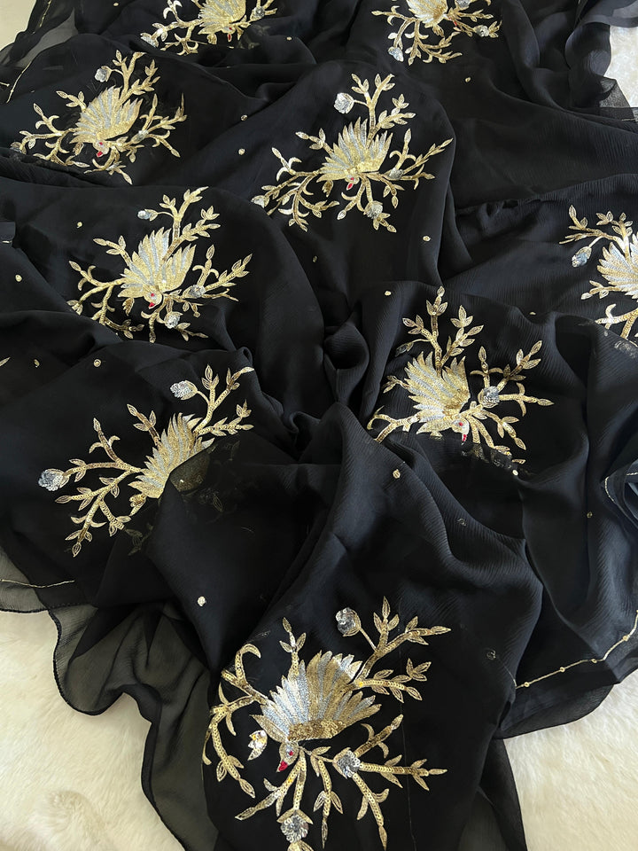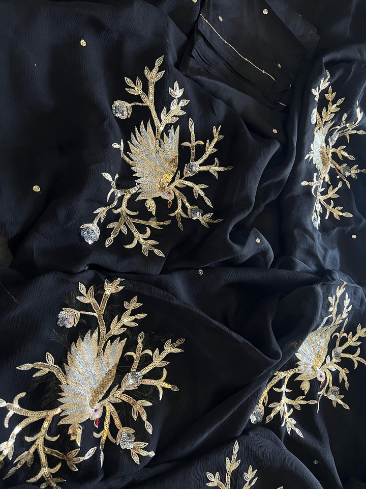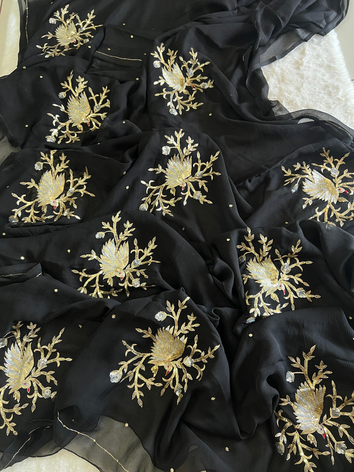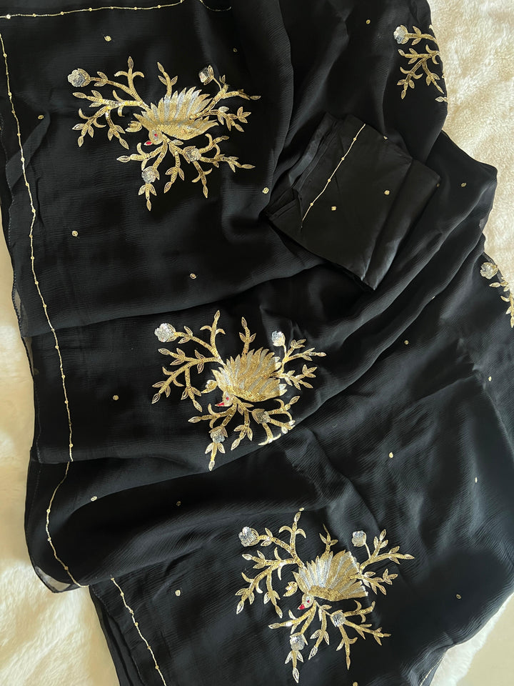 Eternal elegance meets timeless craftsmanship ✨ — Mridula is a captivating saree crafted from Pure Double Diamond Chiffon in a rich, royal Black shade. The drape is adorned with intricate zari handwork motifs and a delicate taari spray all over, lending a soft, celestial shimmer that glows with understated luxury 🌙