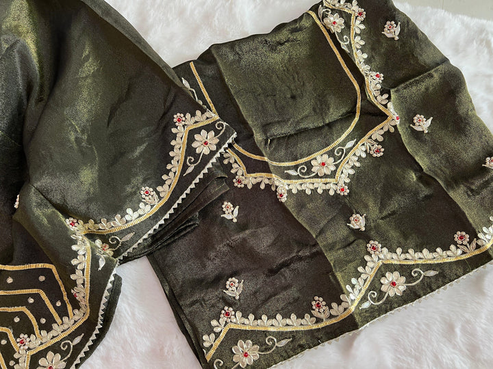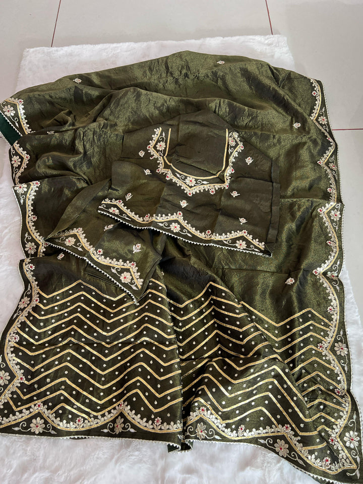Indulge in luxury with the Noor Tissue Saree, crafted from Pure Soft Munga Silk Tissue. The saree features a rich, vibrant mungia green color and is beautifully enhanced with a heavy pallu, showcasing intricate Gotapatti handwork. The heavy blouse complements the saree, adding an extra layer of sophistication and elegance. Perfect for weddings, festivals, or any special occasion, this saree will make you the center of attention.