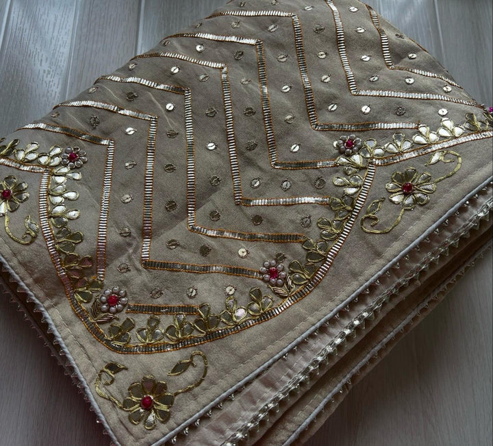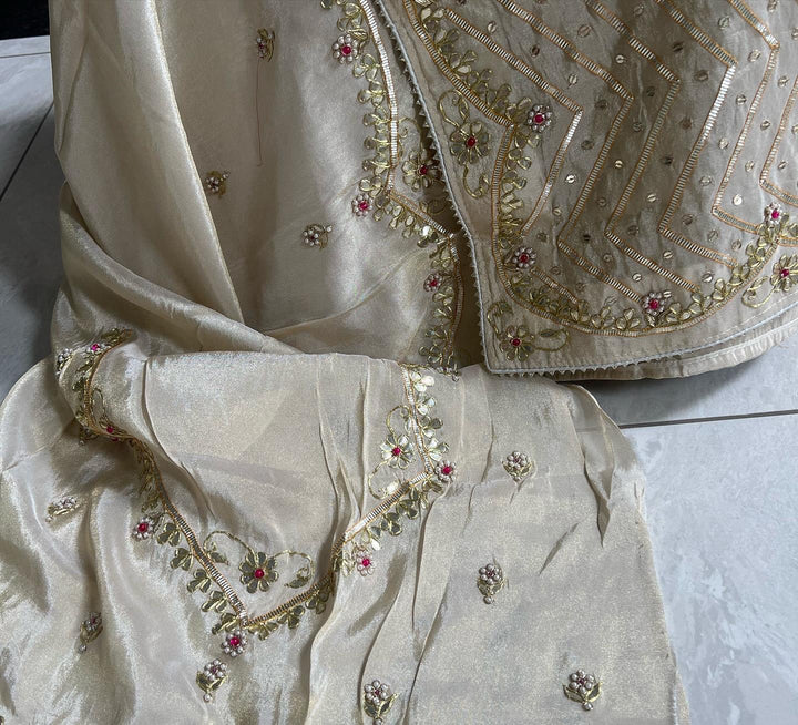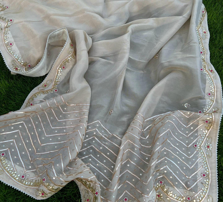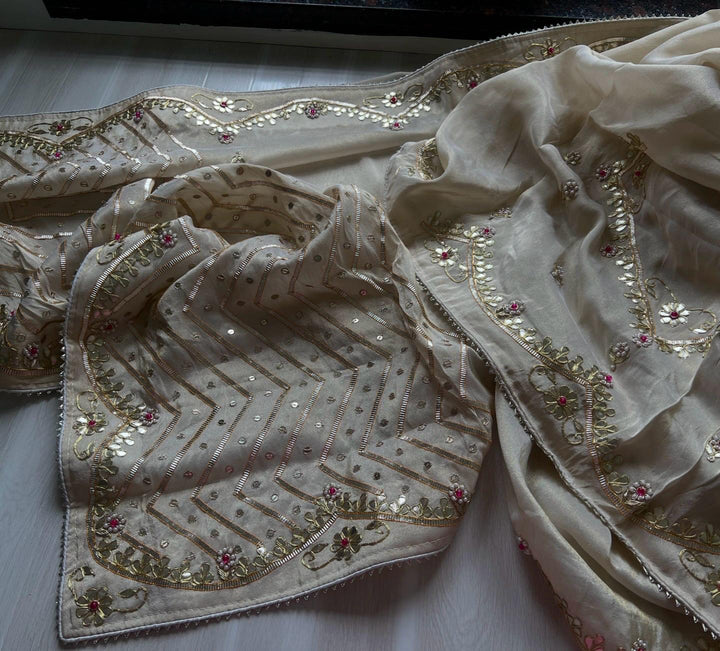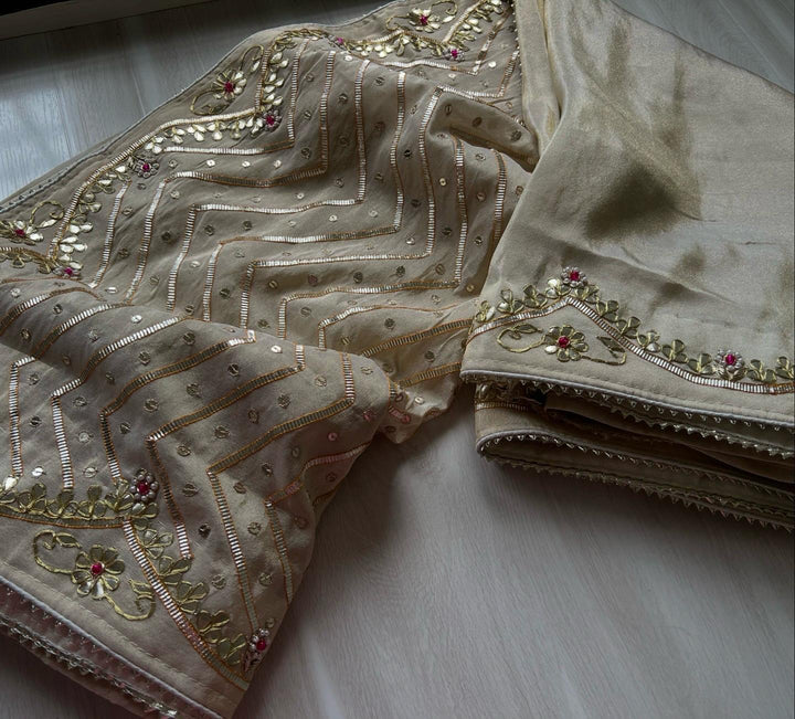Indulge in luxury with the Noor Tissue Saree, crafted from Pure Soft Munga Silk Tissue. The saree features a rich, vibrant off-white color and is beautifully enhanced with a heavy pallu, showcasing intricate Gotapatti handwork. The heavy blouse complements the saree, adding an extra layer of sophistication and elegance. Perfect for weddings, festivals, or any special occasion, this saree will make you the center of attention.