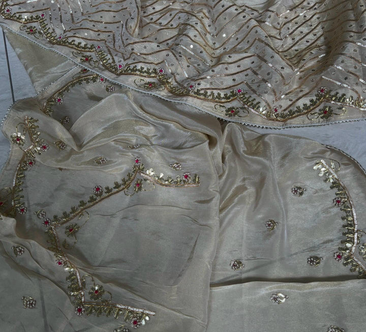 Embrace elegance with Noor Tissue, a saree that combines intricate craftsmanship with timeless beauty.