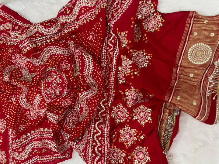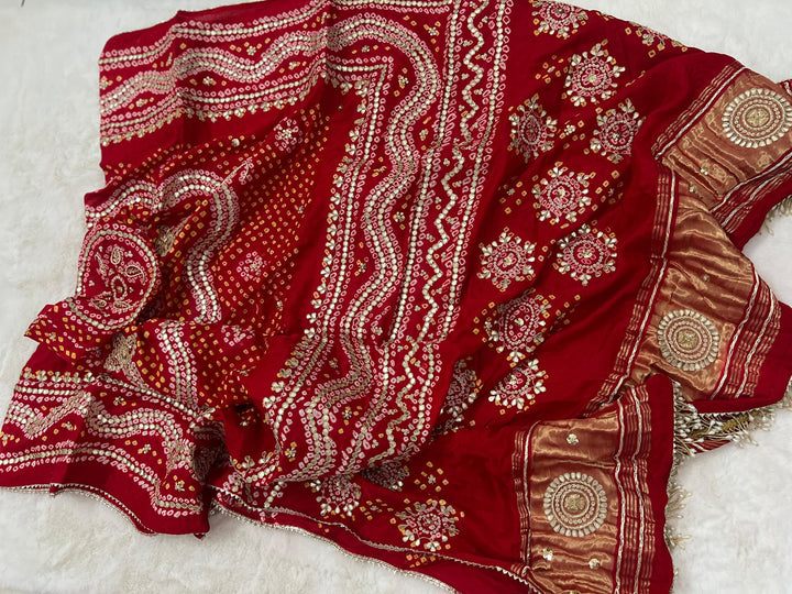 Phera Edition Red Rani – Pure Gajji Silk Red Rani Rai Bandhani Gotapatti & Zardozi Handwork Dupatta