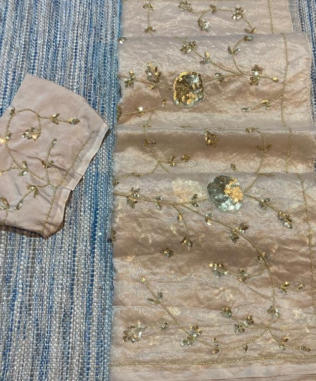 Add a touch of sparkle to your wardrobe with this stunning Light Golden Tissue Silk Saree, and step out in style at your next grand event!