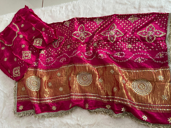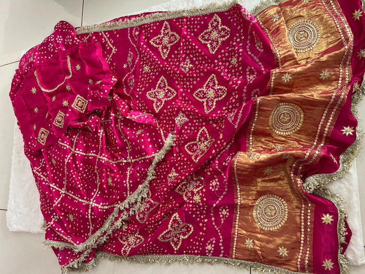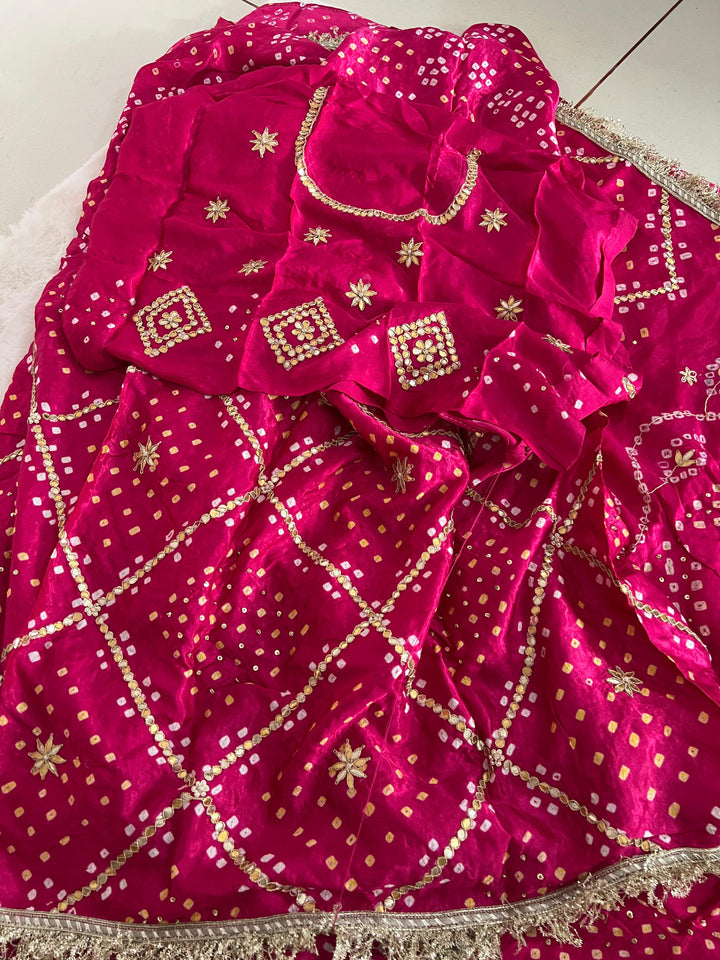 Exclusive Pure Modal Silk Bandhej Saree with Gotapatti & Zardozi Embroidery & Running Blouse