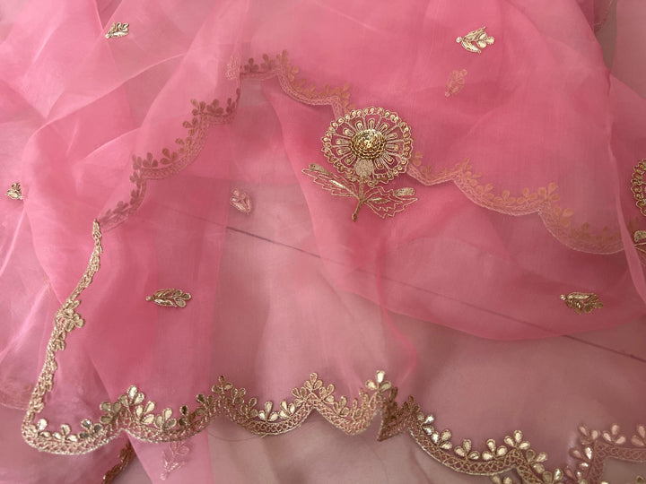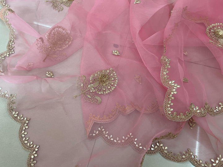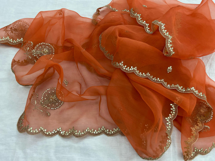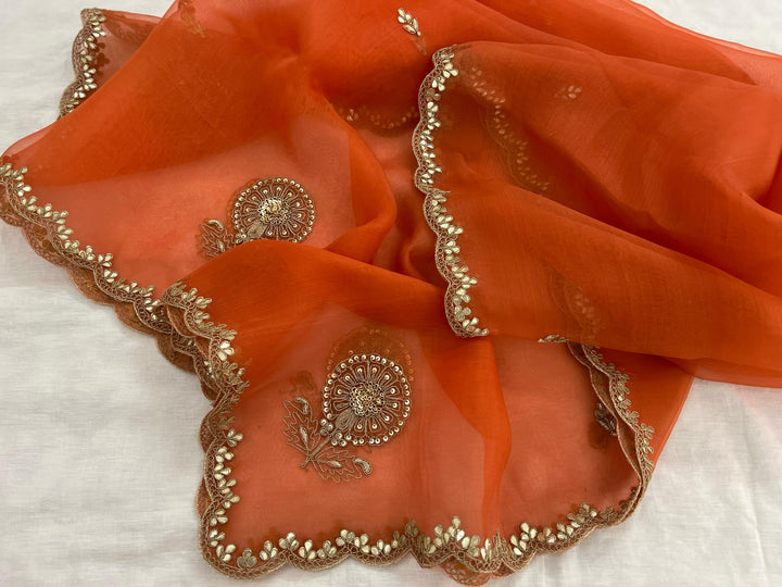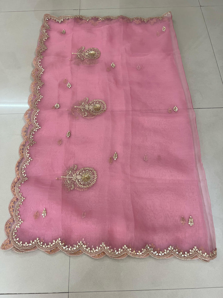 This Pure Organza Silk Saree is a blend of traditional craftsmanship and contemporary elegance. The delicate organza fabric offers a lightweight and ethereal drape, making it a perfect choice for any special occasion. The saree is beautifully enhanced with intricate Dori Marori, Zardozi, Gotapatti, and Sequins Handwork that adorn the scallops and motifs all over. These fine embellishments add a touch of royal charm and opulence to the saree, making it truly mesmerizing.