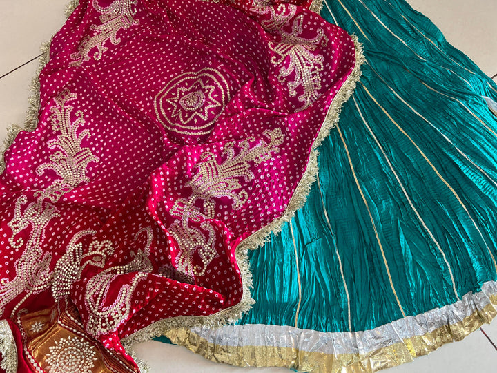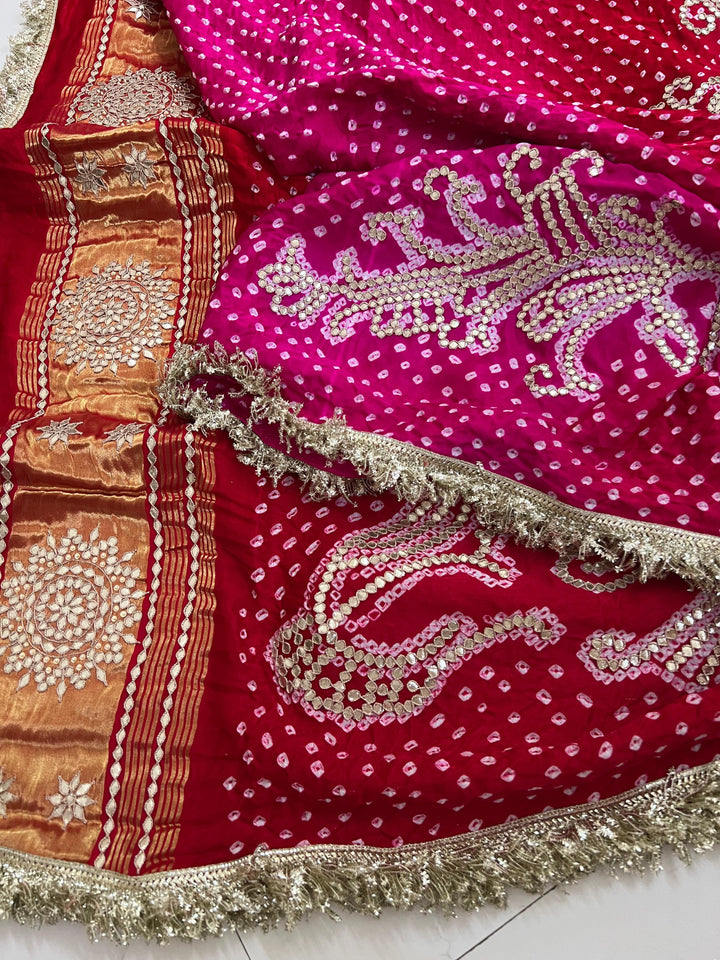Indulge in the richness of tradition with this Red Rani Bandhani Dupatta, crafted from luxurious pure gajji silk. The dupatta features exquisite handmade rai bandhej patterns in a deep, regal red, complemented by intricate gotapatti and zardozi handwork, creating a perfect balance of elegance and grandeur. Ideal for Indian weddings, festivals, or any special celebration, this handcrafted masterpiece is designed to add a royal touch to your ensemble. With its intricate detailing and timeless appeal, this dupatta is a must-have accessory for those seeking to make a statement on any occasion.