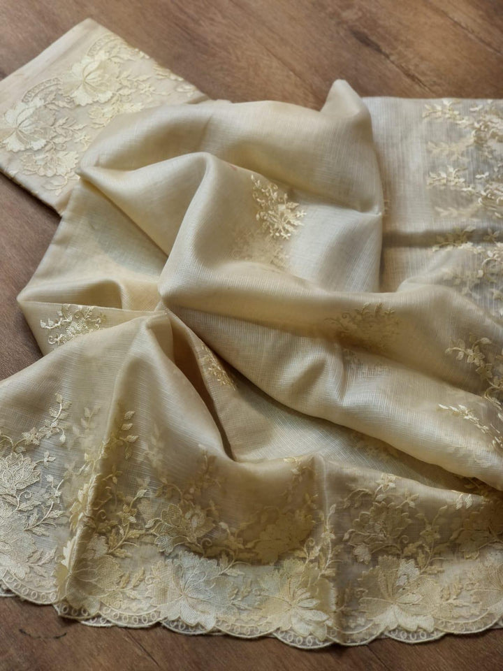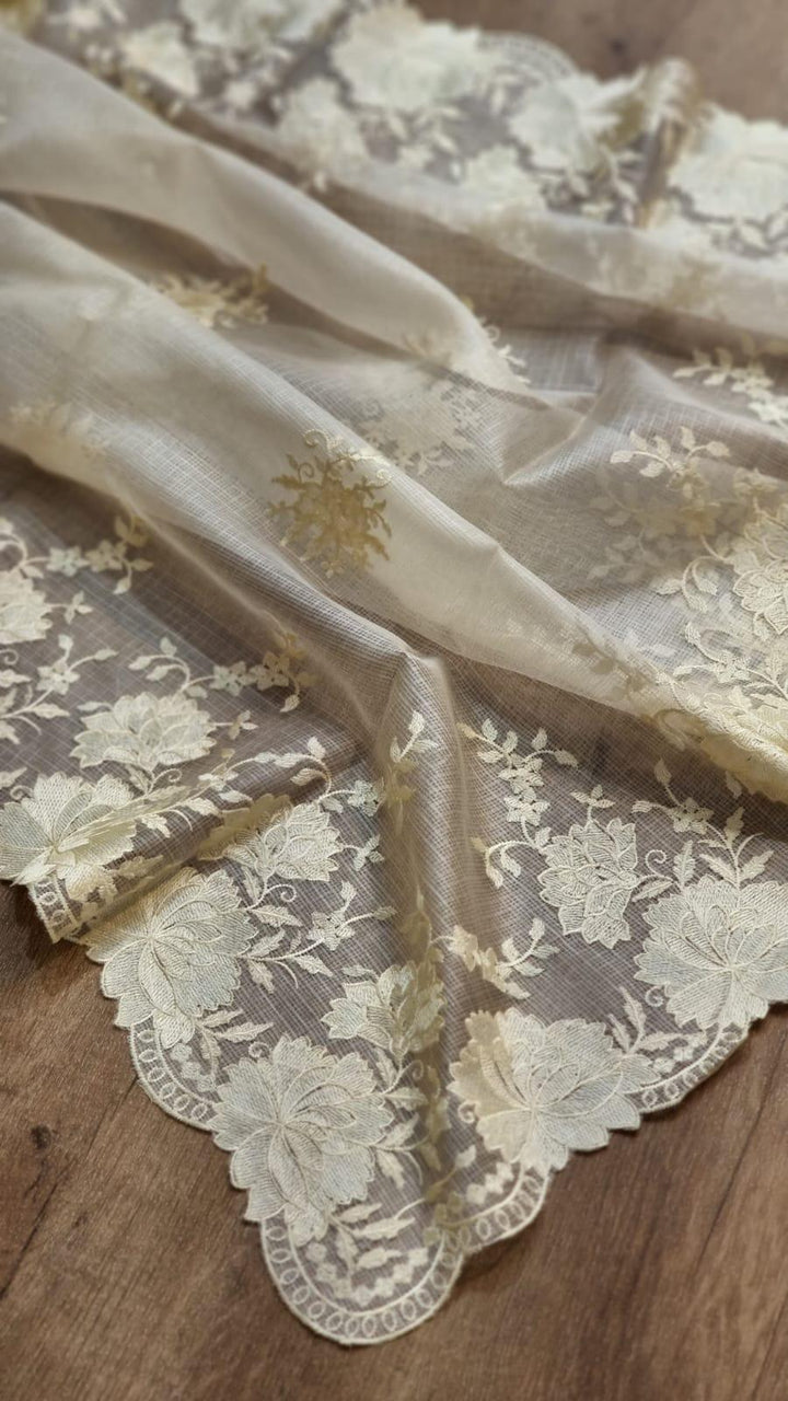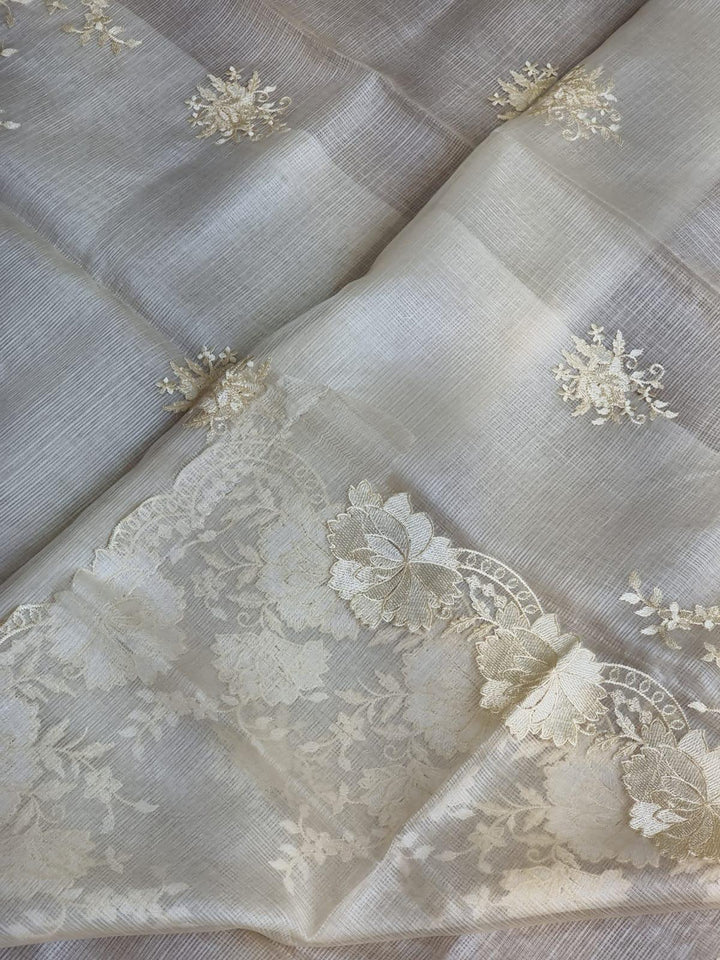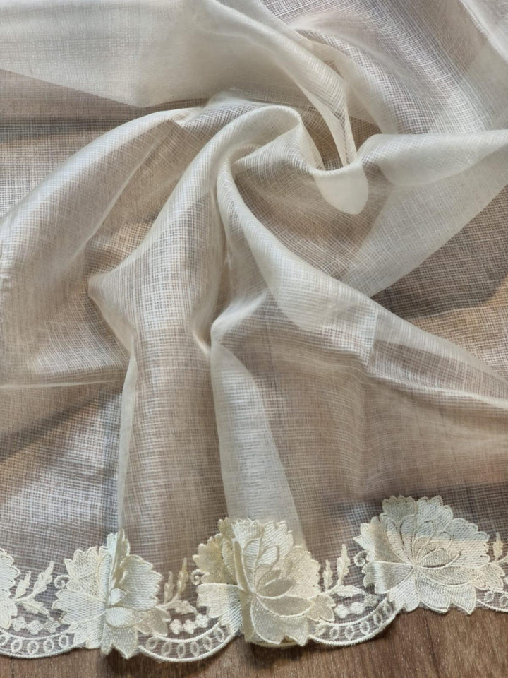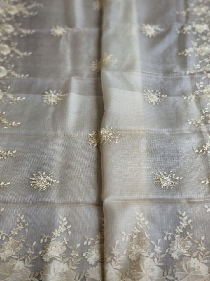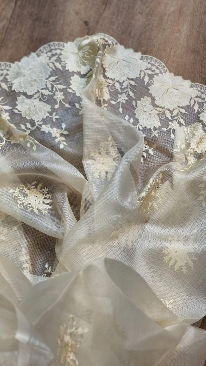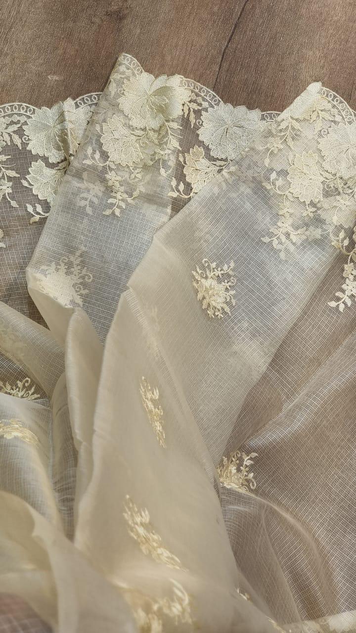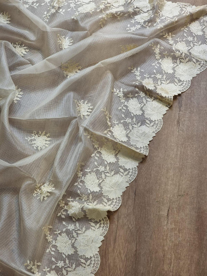 Elevate your elegance with this beautifully crafted Safeda Tussar Kota Silk Saree, the perfect couture for your dreamy date! Made from pure Tussar Kota silk, this saree offers a luxurious and lightweight feel, making it ideal for special occasions. The saree features a delicate cutwork scalloped border that adds a touch of sophistication, while the intricate floral embroidery all over the fabric enhances its timeless beauty.