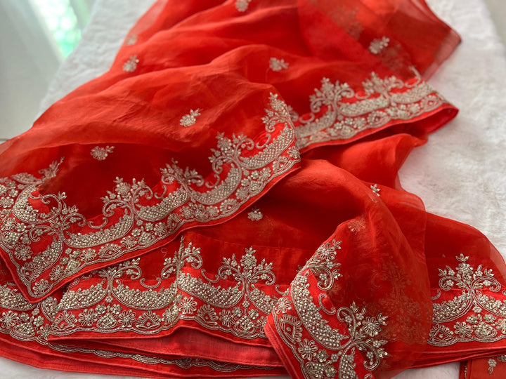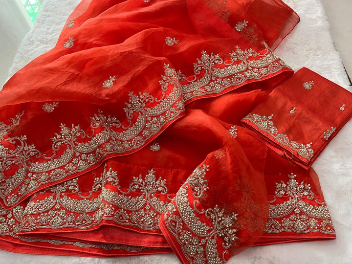 The SHAADI Bridal Saree is a breathtaking masterpiece, designed to capture the essence of traditional luxury and modern elegance. Crafted from rich orange-colored pure organza silk, this saree is beautifully enhanced with intricate handwork, including delicate Dabka, Zardozi, sequins, Nalki, and pearls. The heavy border on both the saree and the blouse adds an exquisite touch of grandeur, making it the perfect choice for your most special occasion. The blouse is made from pure Chanderi silk, offering a lightweight yet luxurious feel. This bridal saree is a stunning fusion of timeless craftsmanship and opulent design, ensuring you shine with elegance and grace on your big day.