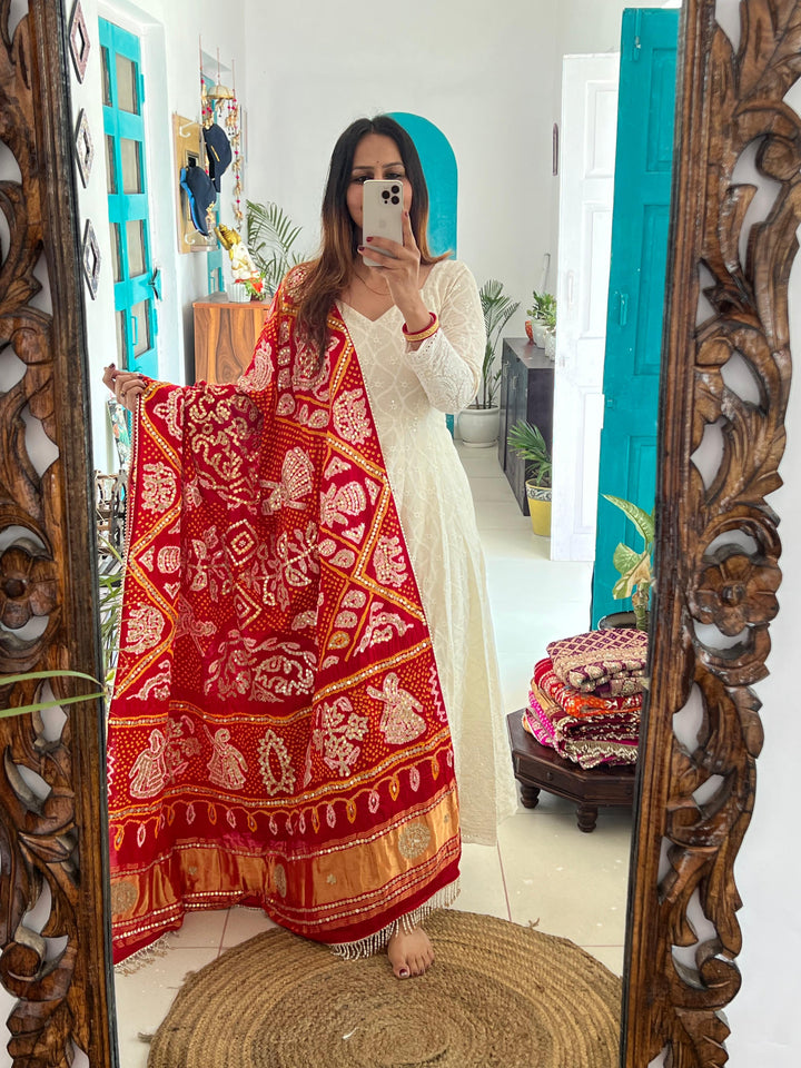 This exquisite Pure Gajji Silk Sindoori Laal Bandhani Dupatta is a perfect blend of traditional charm and modern elegance. Featuring intricate Bandhani tie-dye work in vibrant Sindoori red, it is further enhanced with delicate Gota Patti embroidery, adding a touch of regal sophistication. Lightweight yet luxurious, this dupatta is a versatile accessory that beautifully complements both ethnic and contemporary outfits, making it an ideal addition to your wardrobe for any festive occasion or celebration.