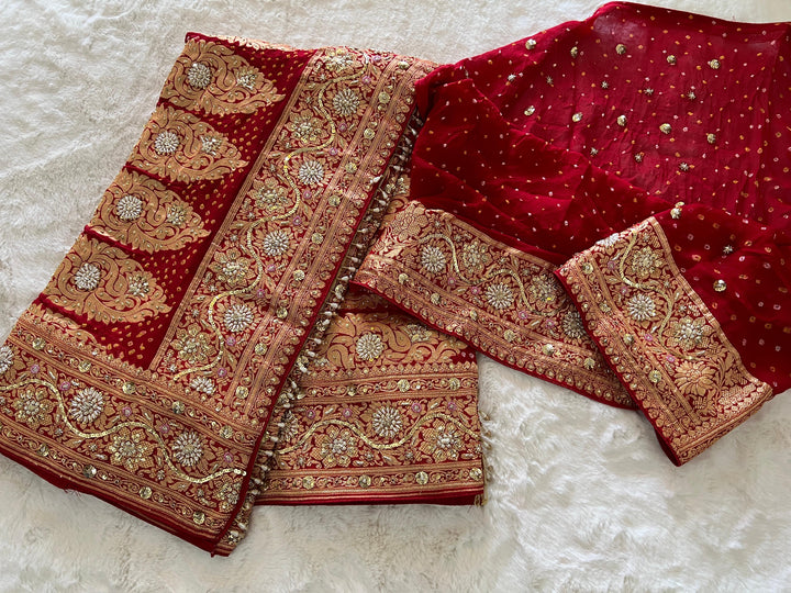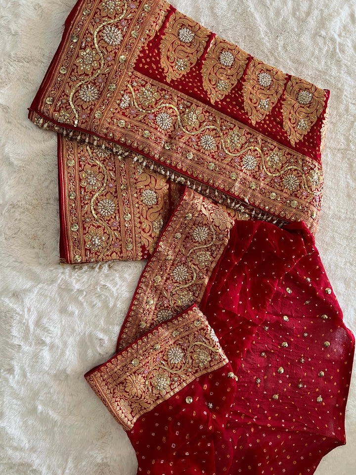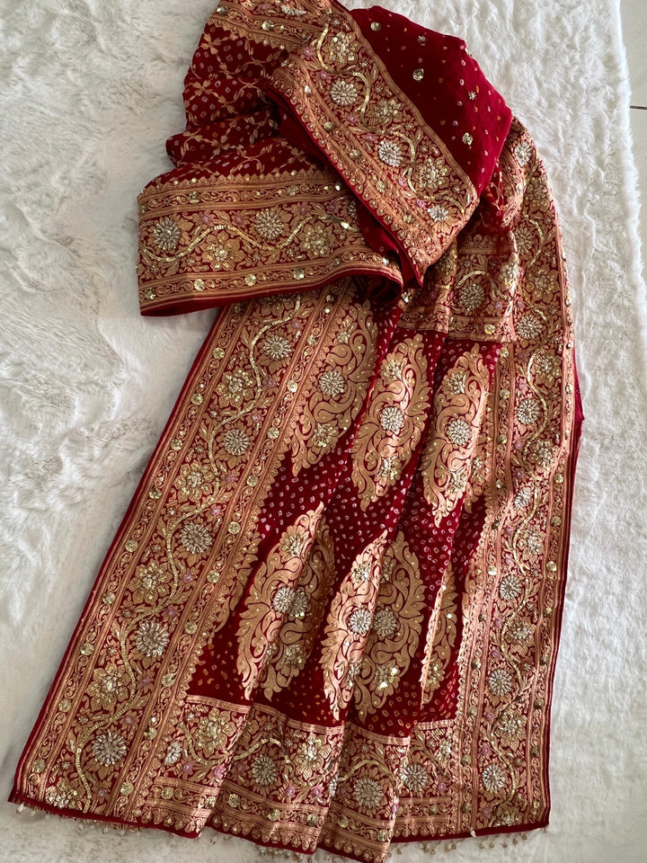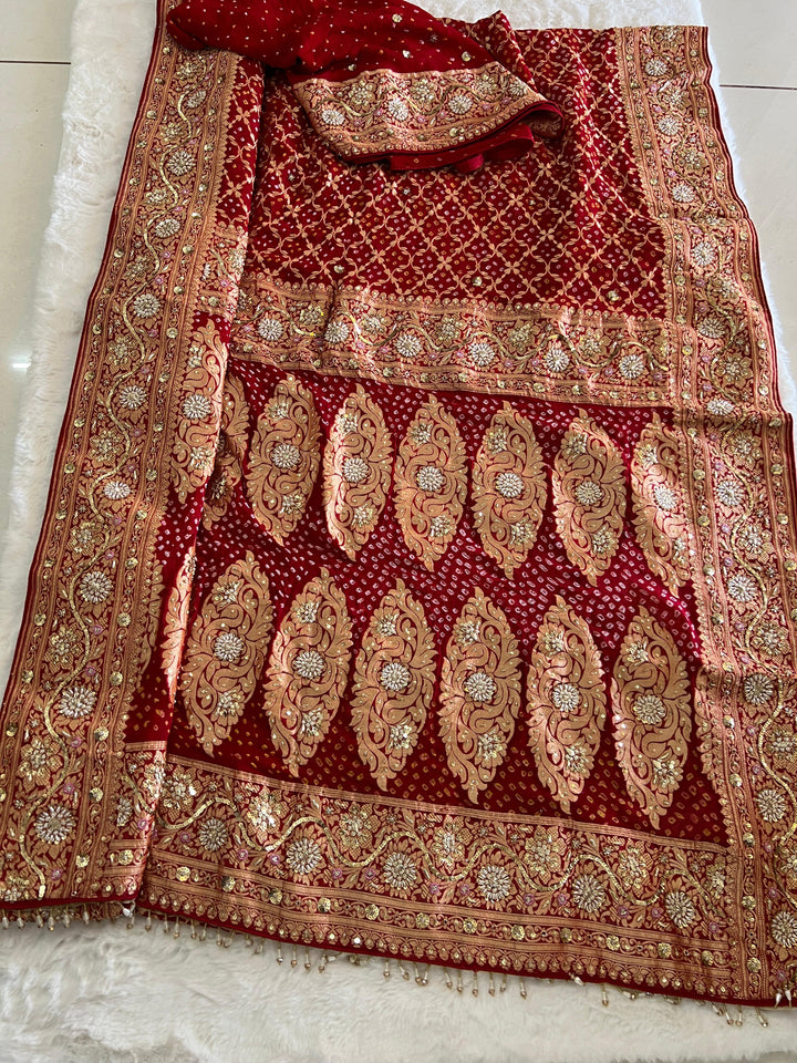 Product Ready to Dispatch. Order Now. Surkh Laal Bridal Trousseau ❣Rai Bandhej X Zardozi Step into timeless tradition with our exclusive Pure Georgette Rai Bandhej Gharchola Bandhani Saree, a regal...