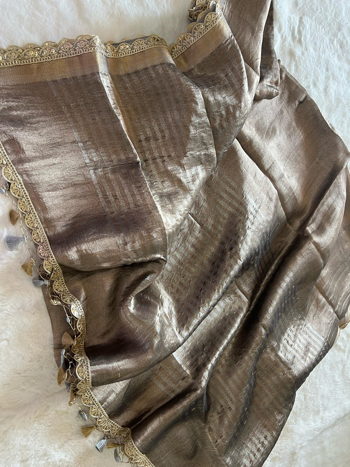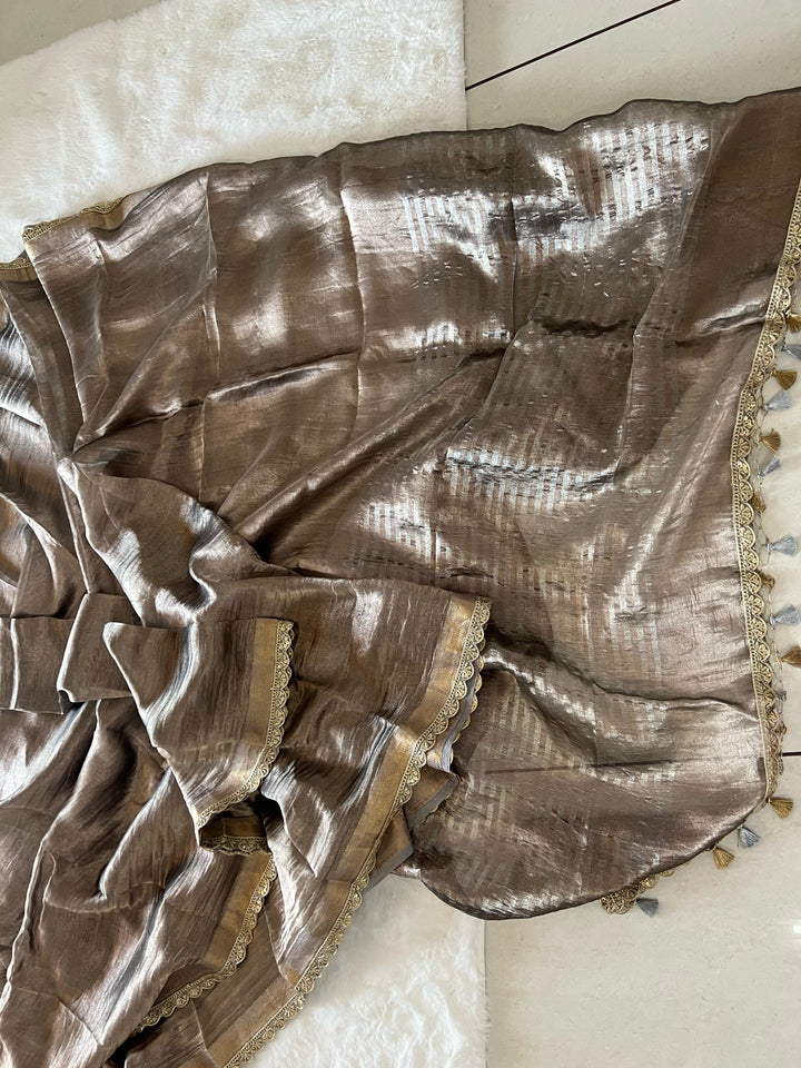 Light, luxurious, and stunning—this Tissue Silk Saree promises to be a standout piece in your wardrobe, perfect for creating unforgettable moments.