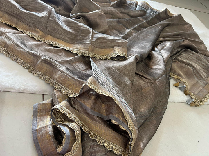 Step into elegance with our Pure Tissue Silk Handwoven Saree, a perfect blend of traditional craftsmanship and contemporary charm. This exquisite saree is crafted from luxurious tissue silk, offering a delicate and lightweight drape that enhances your grace. The saree is beautifully enhanced with intricate lacework all over, adding a touch of sophistication and finesse.